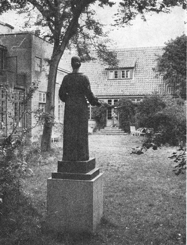 Skagens Museum set fra den gamle Brøndum’ske have. I forgrunden Astrid Noacks statue af Anna Ancher.