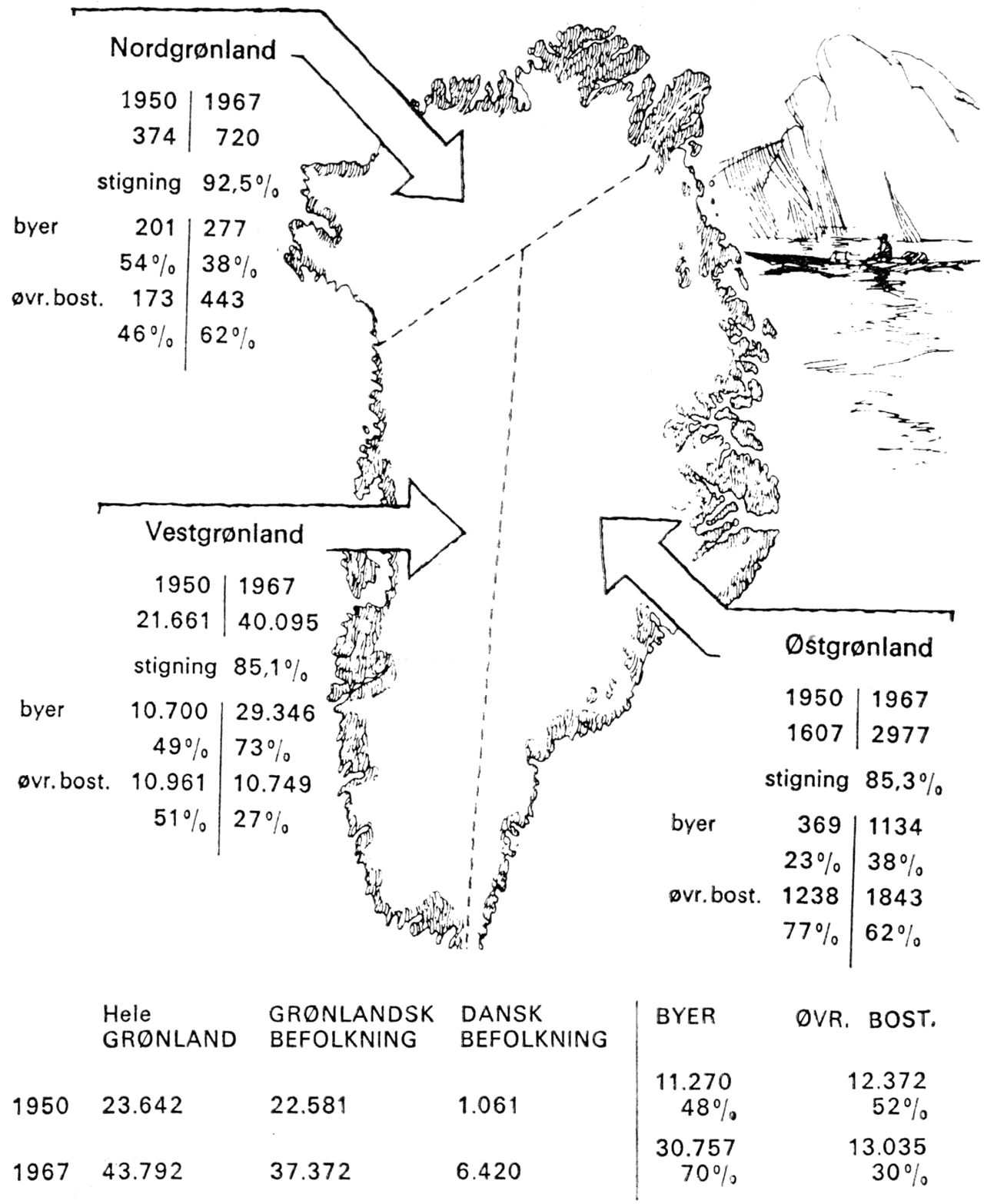 Fødselsoverskuddet udgjorde 1967 1370, men som følge af tilflytning (700 pers. netto flyttede fra Danmark til G., mens nettofraflytningen af grønlændere var knap 400) var befolkningstilvæksten ca. 1700.