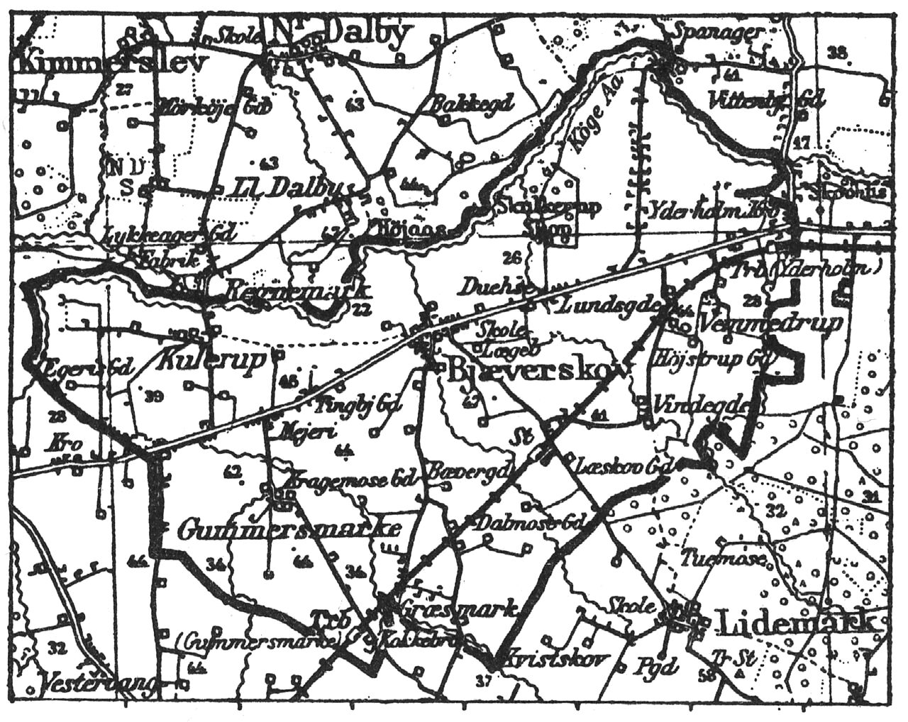 I sognet byerne: Bjæverskov (1100t. Byaverscog, o. 1370 Byæuerskow; u. 1798) m. kirke, skole (udv. 1940) m. bibl. (opret. 1916; 1500 bd.), forsamlingshus (opf. 1935), kontor for Køge Bank og Østsjællands Landbobank, to maskinstat., idrætsanlæg (anl. 1936), andelskølehus (1947), vandværk (anl. 1919), teglværkslergrav (anl. 1940); ved Køge-Ringstedbanen ligger Læskovminde børnehjem (opret. 1938; ca. 20 pl.), Bjæverskov jernbanestat., post- og telegrafeks. og telf.-central og madrasfabrik; Vemmedrup (*1414 Wæmethorp; u. 1791) m. ml.; Kulerup (her? 1355 Kulæthorp; 1421 Kylorp; u. 1781) m. cementvarefabrik; Gummersmarke (1319 Gummæsmark; u. 1798) m. andelsmejeri (Fuglebæk) og jernbanehpl. – s. 128 Saml. af gde og hse: Lundsgde (*1414 Lundsgardh); Vindegde (*1414 Windegardh); Græsmark; Dalmose; Kulerup Enghave. – Gårde: Høgstrupgd.