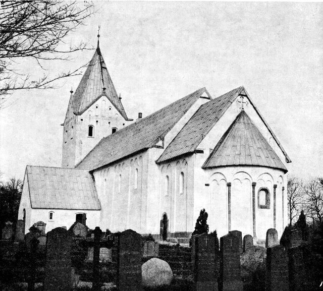 Den blytækte og hvidkalkede kirke (viet Skt. Nicolaus) består af romansk apsis, kor og skib m. sengotisk v.forlængelse; dertil er i ny tid, 1932, føjet tårn i v. og våbenhus i s. Den romanske bygn. er i det væsentlige opført af tuf på granitsokkel. Apsis har skråkantsokkel, og rundmuren er opdelt i fem rundbuede blændingsfelter m. tvilling-rundbuede inderblændinger, adskilte af halvsøjler af tuf m. terningkapitæler og klokkeformede baser m. hjørneflige, udført af granit. På korgavlens top er der et lille, korset blændingskors, den sidste rest af en dek., der har haft stigende rundbuer langs taglinien. Kor og skib har på flankemurene over en meget uregelmæssig attisk profileret søjle lisener og rundbuefriser, på koret to felter hver m. to rundbuer, på skibet fire felter hver m. tre buer. Den rundbuede n.dør ses tilmuret, og på korets s.side skimtes sporene af en ligeledes tilmuret præstedør. I apsis er der et genåbnet el. rekonstrueret rundbuevindue, på korets n.side to og i skibets n.mur fire tilsvarende, ret højt siddende; i skibets s.væg ses også tilmurede rundbuevinduer. Indvendig står den runde korbue, der er noget omdannet 1843. Apsis har halvkuppel, kor og skib flade lofter. Allr. i unggotisk tid fik skibet en v.forlængelse af munkesten m. smigede spidsbuevinduer, og vistnok i sengotisk tid blev der vestl. ved skibets s.side opført et †tårn, der 1835 blev nedbrudt og erstattet af et våbenhus, samtidig m. at murværket blev flikket m. mursten og delvis skalmuret. 1932 blev bygn. istandsat, og der opførtes v.f. skibet et glatpudset tårn m. lavt pyramidespir ml. spidsgavle, bekostet af dav. og tidl. sogneboere; et særl. stort bidrag blev ydet af konsul Chr. Marius Windfeld-Hansen. Ved sa. lejlighed blev våbenhuset ombygget og fik blændingsgavl. – Allr. 1870 blev der i korbuen iagttaget kalkmalerispor, og 1940 afdækkede E. Lind rester af kalkmalerier fra o. 1200–25; i apsishvælvet en meget dårligt bev. fremstilling af Kristus i sin herlighed m. evangelistsymboler og siddende apostle, på apsisbuens underflade to hellige konger og to bisper, på buens forkant akantusornament; på korbuens underflade det hyppigt forekommende motiv Kains og Abels ofring (kun Kain bev.) (Nørlund-Lind.K. nr. 80). Apsishvælvets maleri kunne ikke restaureres, og her malede Stefan Viggo Pedersen 1954 et nyt maleri, Kristi forklarelse. Korets bræddeloft er prydet m. et oliemaleri fra 1700t.: Kristus svævende i skyer, omgivet af basunblæsende engle. – På det nye, murede alterbord står som alterprydelse en messingkopi af Herlufsholm-krucifikset. I det gl. alterbord blev der 1835 fundet en urørt helgengrav indeholdende en fingerknogle. Den tidl. altertavle fra 1769, et ret pompøst arb. i senbarok m. rund, brudt fronton, figurer af Retfærdigheden og Troen og Chr. VII.s og Caroline Matildes initialer har maleri af den korsfæstede fra 1956–57. Det opr., lidt sødladne midterbillede, Gethsemane, motiv ved Andreas Nielsen Windfeldt efter altertavlen i Vor Frelsers kirke i Kbh., er ophængt i kirken. Balusterformede barokstager 1642 m. initialer NS. Korbuekrucifiks i unggotik, o. 1350, m. sidefigurer, der nu er anbragt ved den tilmurede n.dør. Endnu o. 1850 var gruppen anbragt tværs over korbuen. Romansk font af Weser-sandsten, et interessant importstykke, vistnok fra Bentheim, m. akantusfrise og rundbuer (Mackeprang.D. 365, 367). Nederl., drevet messingfad m. syndefaldet og versalindskrift, hvori årst. 1623. Fontehimmel i barok fra 1695 m. Chr. V.s initialer, istandsat 1843, da den blev overtaget fra Hygum kirke. Prædikestolen af karnaptype er et rigt snitværk i sen barok fra 1657 m. hjørnesøjler og relieffer fra Jesu historie og samtidig himmel. Den blev nystafferet 1768 af B. Richter og atter 1925–26 af fru J. Juul Brask. Opgangsdøren fra 1768 har allegoriske malerier, bl.a. kong David og vandringsmand. Tolvarmet lysekrone i barok fra 1600t. Tremastet skibsmodel, »Tordenskiold«, fra 1945. Klokke: 1) Melchior Lucas, Husum, 1599; 2) De Smithske Støberier, Ålborg, 1921. Den sidstn. er omstøbt af en †klokke fra 1791 af Joh. Nic. Bieber, Hamburg. – Gravsten: 1) Hans Nielsen af Farup, † 1648; 2) Terman Hansen, † 1685, og hustru; 3) Morten Termandsen, † 1711; 4) Terman Knudsen, † 1714; 5) Termand Mortensen, † 1738; 6) Hans Nielsen Windfeld, † 17 …