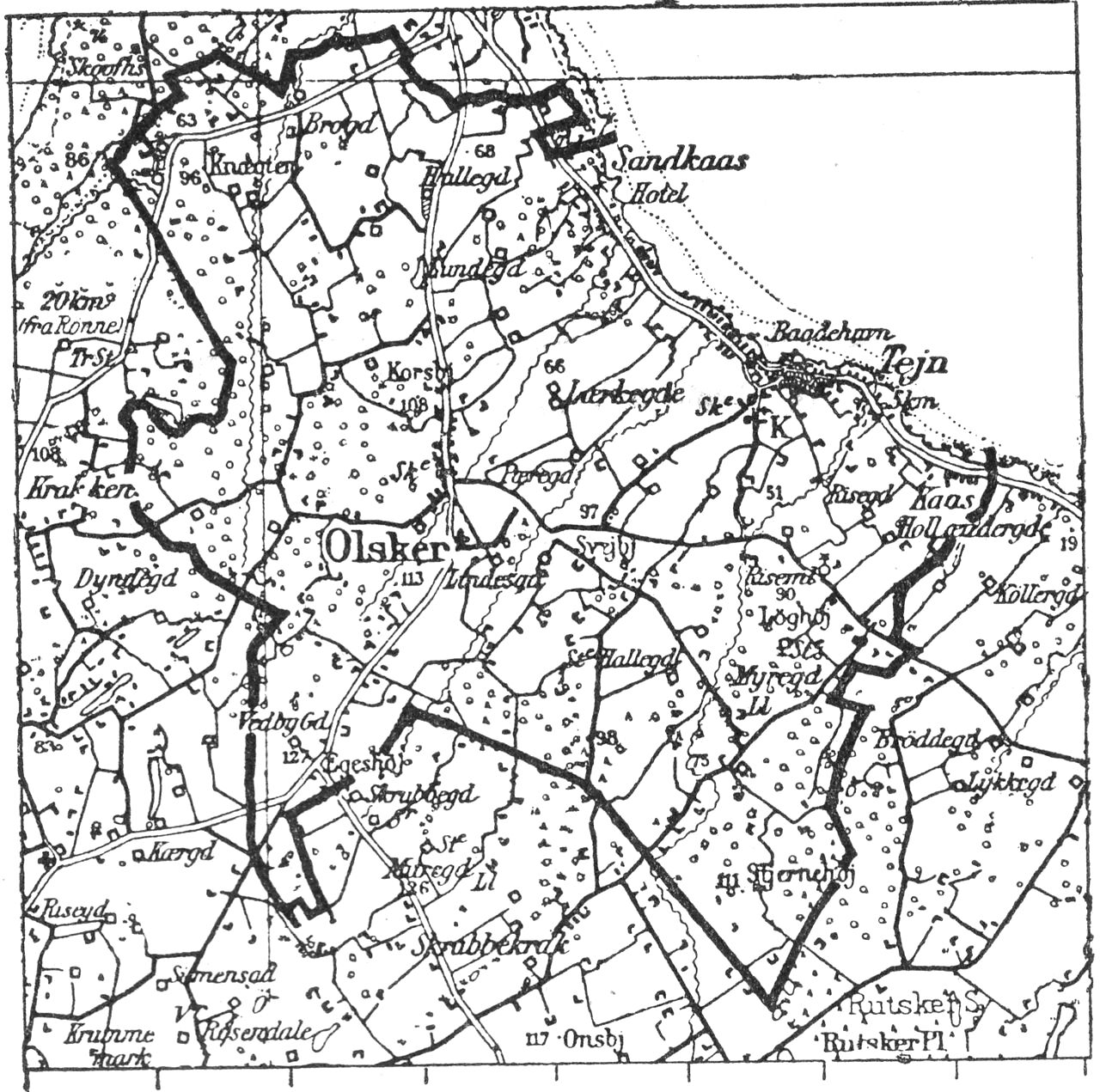 I sognet: Olskirke (1379 ecclesie sancti Olaui, 1569 Olss Kircke; sognet: 1555 Scte Oluffs Soghen, Olskersogen), højt beliggende tæt s.f. vejkryds; m. præstebol. (opf. 1942, arkt. Karl Reker) samt byerne: Olsker m. skole (Sct. Ols Kirkeskole, opf. 1911), hvori sognebibl. (fordelt ml. skolerne; opret. 1941; 1700 bd.), missionshus (Bethel, opf. 1862 for Trandbergs menighed, sen. overtaget af Indre Mission), baptistkapel (indviet 1942, i tidl. smedie), forsamlingshus (opf. 1908, kommunalt), ml. (Bakkemølle, vind- og motorml.), stenbrud (Præsteløkken; A/S Valdemar Handberg, se: Allinge-Sandvig kbst. s. 455) og rutebilstat.; Tejn (1569 Teding, 1570 Thegene), B.s største fiskerleje – bymæssig bebyggelse m. 1950 i alt 709 indb. fordelt på 206 husstande; fordelingen efter erhverv var 1940 flg.: 249 levede af landbrug, fiskeri m.v., 112 af håndværk og industri, 27 af handel og omsætning, 16 af transportvirksomhed, 17 af administration og liberale erhverv og 63 af aldersrente, formue, pension olgn., medens 2 ikke havde givet oplysning om erhverv – m. distriktskirke og kirkegård (indviet 1949), sogneskole (opf. 1891) og forskole (opf. 1929), to missionshuse (Getsemane, opf. 1890, Indre Mission; Luthersk missionsforenings mødesal, opf. 1938) samt Philadelphia menighedshus (opf. 1933), kom.kont. (1955), stubmølle (fredet, tilh. foreningen Bornholm), pensionater, filial af Bornholms Laane- og Diskontobank, 13 silderøgerier (de 6 i drift), andelsfiskesalgsforening (grl. 1918, udv. og moderniseret 1945 m. ishus, filetfabr. og lynfrysningsanlæg, i sæsonen 35–40 arb.), hønseri, vandværk (opf. 1950), rutebilstat. og posteksp. samt bådehavn m. 3 bassiner (anl. 1865, udv. 1867 og 1887–88, bedding anl. 1925, ombygget 1946–49, vanddybde i indløb 2,8 m, ved kaj 2,5–2,2 m, rødt fast fyr på nordre mole og tågesignal, en tone hvert 30. sekund, 45 hjemmehørende både på fra 4 til 20 t) og toldsted under Allinge toldkammer. – Saml. af gde og hse: fiskerlejet Kås; Sandkås m. hotel og pensionater; Humledal m. andelsmejeri (opf. 1888, ombygget 1949); Vedby (1624 Wedbye) m. radarmast (opf. 1943 af besættelsesmagten, nu anvendt af militæret); Hollændergde; Lærkegde. – Gårde: Hullegd. (13,1 tdr. hartk., 54,4 ha; ejdsk. 90, grv. 56,2); Lindesgd. (12,5 tdr. hartk., 78,4 ha; ejdsk. 92, grv. 51,3); Brogd. (1676 Brugaard); Pæregd. (her? 1593 Peregd.); St. Hallegd. (1580 Hallegd.); St. Myregd. (1632 Myrregd.); Lundegd.; Habbedamsgd. (1636 Haberdamsgd.); Skovgd.; Lynggd. (1685 Lynggd.); Dalegd. (1569 y Dalenn); Maegd. (1569 Maegords). – Dalegd. Stenbrud (firma Ernst Petersen, Hasle, jf. s. 521).