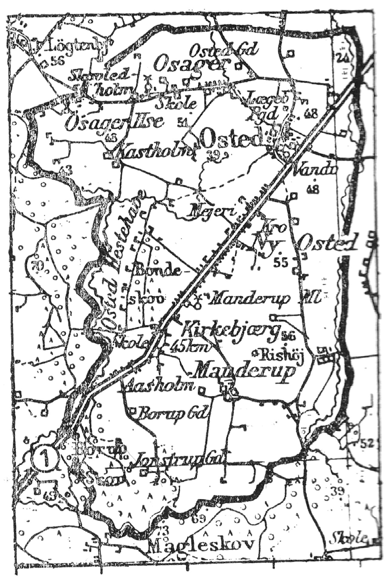 I sognet byerne: Osted (o. 1370 Ostadhæ; u. 1793 og 1805) m. Ny Osted – bymæssig bebyggelse m. 774 indb. fordelt på 241 husstande – langs hovedvej 1 m. kirke, præstegd., skole m. kom.bibl. (opret. 1941, 4700 bd.), O. fri- og efterskole (opret. 1917), kom.kontor, alderdomshjem (opf. 1928, 30 pl.), andelsmejeriet Landmandslyst (opf. 1957), bankfilial, kro, kafé, savværk og telf.central; Kirkebjerg ved hovedvejen med sygehjem (i den gl. skole), dørfabr. og telf.central; Osager (*1288 Osakar; u. 1796) m. mosteri (i den gl. skole); Bregentved (1263 Bregnethvet; u. 1794–95); Manderup (*1268 Mantorp; u. 1794); Åsholm. – Saml. af gde og hse: Borup Hse; Kastholm (*1288 Castholm; u. 1796–97); Osager Hse; Osted Hestehave. – Gårde: Jonstrupgård (8,7 tdr. hartk., 142 ha; heraf 97 skov; ejdsk. 378, grv. 144).