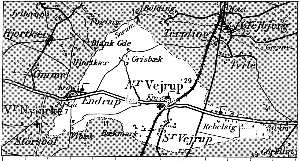 I sognet byerne: Vejrup (Nr. Vejrup, 1291 Withrup, 1330–48 Wythorp, 1664 Nør Weyrup; u. 1801) – bymæssig bebyggelse m. i 1960 316 indb., fordelt på 108 husstande (1955: 273 indb.); fordelingen efter erhverv var flg.: 17 levede af landbr. m.v., 123 af håndv. og industri, 37 af handel og omsætning i øvrigt, 44 af transport, 23 af administration og liberale erhverv, 10 af anden erhvervsvirksomhed og 57 af formue, rente, understøttelse olgn.; 5 havde ikke givet oplysning om erhverv – m. kirke, præstebol., centralskole (opf. 1960, arkt. Jac. E. Kjær), bibl. (i skolen; opret. 1934; 1900 bd.), missionshus (opf. 1920), kro, Vejrup Sogns Spare- og Laanekasse (opret. 1875; 31/3 1963 var indskuddene 1,8 mill. kr., reserverne 83.000 kr.), filial af Varde Bank, andelsmejeri (opret. 1892), andelsfoderstofforening, jernbanestat., posteksp. og telf.central; en del af Endrup (resten i V. Nykirke so., Skast hrd.) m. andelsmejeri (opret. 1884, omb. 1892 og 1917). – Saml. af gde og hse: V. Vejrup; Sdr. Vejrup (1664 Synder Weyrup); Sdr. Vejrup Østermark; Rebelsig (1606 Rebbelsigh) m. teglværk; Nr. Grisbæk (1420 Griisbek Mark, 1688 Nørre Grisbech) m. dambrug; Sdr. Grisbæk (1496 Søndhergrisbech march); Vibæk (1606 Wibeck; u. 1802); Bækmark. – Gårde: Lykkesgd. (1606 Lackisgaardh, 1664 Lockisgaard); Knoldkærgd.; Bjerregd.; Suderkroggd. (1610 Suder Kroeg); Grisbækgd.